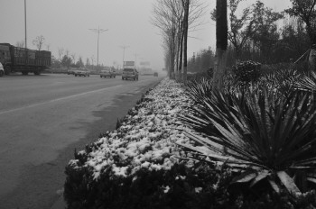 7日,今冬第一场雪降落潍坊。图为,北海路与206国道交汇处马路两边的绿化带内落满了雪花。 本报记者 李涛 摄.