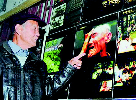 毛子埠惨案幸存者赵友海观看纪念馆内的展品。(资料片)