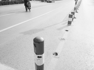被破坏的路桩。 本报见习记者 孙越 摄
