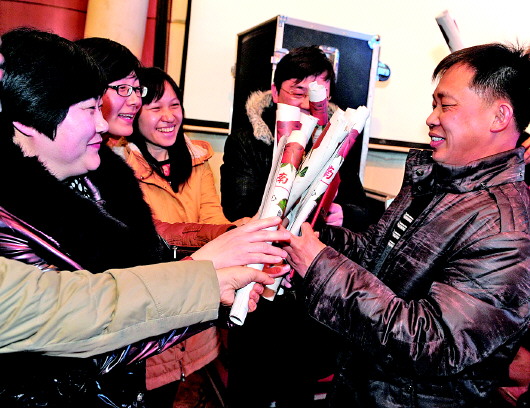 ◥观众将折好的玫瑰花送给责任市民。  本报记者  周青先 摄