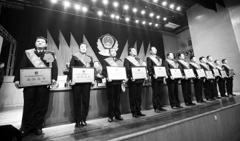 10日下午,济宁市公安局举行2014年机关总结表彰大会。会议上对2014年涌现出的工作成绩突出的单位和个人进行了集中表彰。图为获奖代表上台领奖。 本报记者 姬生辉 通讯员 英芯茳 摄