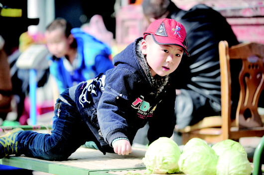 6岁的苏彦博独自在菜摊上玩耍。彦博在七里堡批发市场附近上幼儿园,今年即将升入小学,但他的户籍不在济南,爸爸为这事很着急。