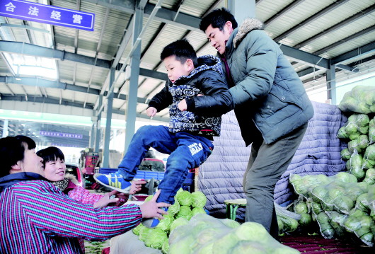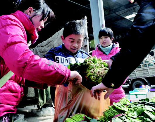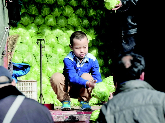 春节期间,张元瑞帮爸妈卖羊年的第一车菜。元瑞是洪楼三小的学生,姐姐在历城一中读高一。他们老家是西营农村的,父母已在市场打拼了25年。目前一家人在市场附近租房住,但已经买了一套房,明年就能入住了。