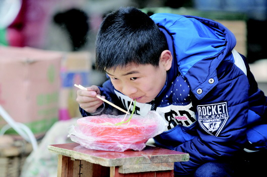 中午时,因父母忙着卖菜,任豪博便趴在小凳子上吃一碗方便面,权当午饭。这两年,能够跟在父母身边生活、上学,豪博非常开心。