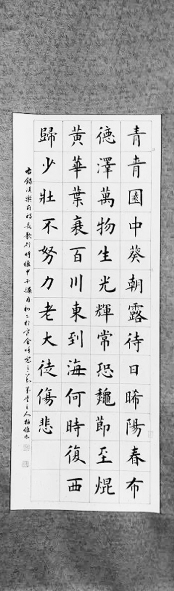 梅维林初习书法是以颜体楷书入门,后又学习欧体楷书,跟随中国欧体楷书大师田英章先生学习。所学楷书法度森严,端庄大气,一丝不苟。