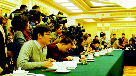6日是北京代表团开放日,代表接受记者采访,图为本报记者高扩获得提问机会。 本报记者 周青先 摄