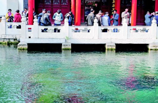 ▲8日上午,趵突泉水位恢复到27.70米,这令看泉的游客感到欣喜。 本报记者 周青先 摄