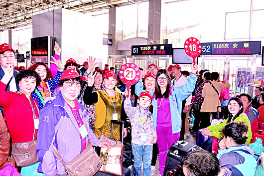4月1日晚,由昆明开来的Y126/7次列车顺利抵达青岛站,696名游客带着笑容满载而归,这是山东中铁旅游广告集团今年开出的首趟旅游专列。图为旅客准备从昆明返程。 王菊园 张栋 摄