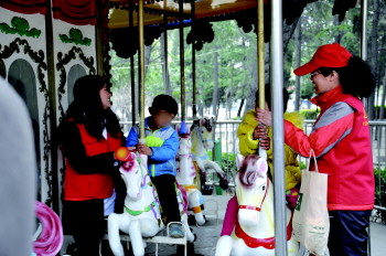 义工们带孩子玩旋转木马。本报记者 袁文卿 摄