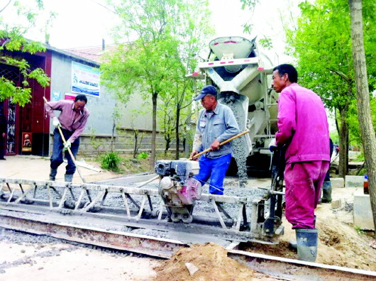 沾化区东三里村的施工队正在往道路上铺混凝土。