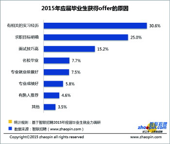 智联招聘调查显示,2015年应届毕业生获得offer的原因,主要归功于有相关的实习经历,这一原因的占比达到30.6%。可见,实习经历对于应届生获得offer有着非常重要的促进作用。