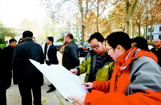 ◥在济南某建设项目现场,施工图联合审查所涉及的各部门人员共同查看现场,这种联合办公的形式让企业少跑腿。 本报记者 张中 摄 (资料片)