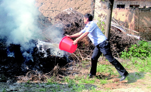 本报单县5月19日讯(记者 周千清 通讯员 刘昆龙) 天气变暖,杨棉絮又开始肆虐。18日下午,单县时楼镇大孟庄行政村居民张某家屋后柴火堆被贪玩孩童用杨棉引燃。幸好被在村庄内走访的两名派出所民警发现,并及时扑灭。