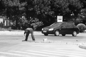 5月25日上午,在乐普大道与天衢东路路口处,一辆运送啤酒瓶的小货车在转弯时有酒瓶跌落碎在行车道,司机停车徒手将玻璃渣清理运走,避免给其他车辆和行人造成困扰,虽然事情不大,但仍要为负责任的司机点个赞。 本报记者 马志勇 摄
