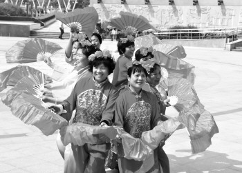 25日,人民公园老年秧歌队的队员们在水城广场上排练扇子舞,据了解,该秧歌队的成员中,年龄都在50岁以上,很多都七八十岁了,但她们顶着烈日坚持排练。