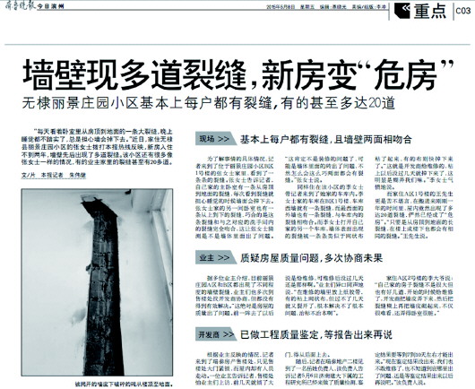 5月8日,本报以《墙壁现多道裂缝,新房变“危房”》为题报道无棣丽景庄园多座房子出现裂痕问题。5月6日,滨州瑞泰房地产开发有限公司委托山东建大工程鉴定加固研究所对丽景庄园B-4#楼墙体裂缝进行项目鉴定,现场对B-4#东单元101、202、401,西单元102、202、201、302、401、601,阁楼东户:3-4-G-L轴车库户室墙体进行了入户检测或调查。