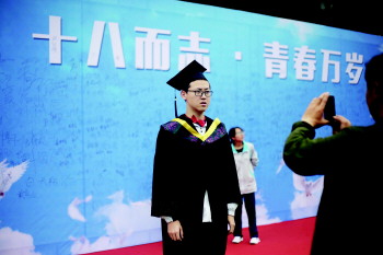 10日,在青岛19中,一名家长在“十八而志 青春万岁”的展板前,为穿着毕业礼服的孩子拍照,为青春定格。当日,该校“致青春·凤鸣朝阳”2015届毕业典礼暨成人礼举行。