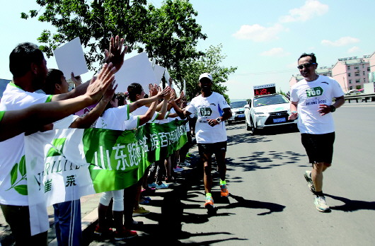 与陪跑嘉宾刘东旭(右)跑完全程,陈盆滨(中)与热情的山东“跑迷”打招呼。 本报记者 王鸿光 摄