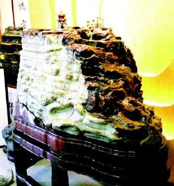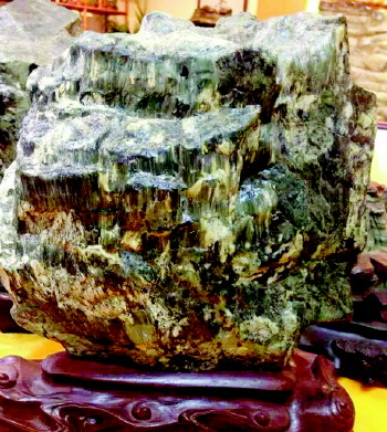一看色彩的变化。崂山绿石不是单一的绿色,色深者墨绿浓黑,色浅者粉绿微蓝,再加上黄、白、赭等色块条纹,变化无穷。二看结晶的变化。绝大多数崂山绿石为层状结晶,不同色彩浓淡交错。三看石质的变化。崂山绿石的矿物组成主要是绿泥石。四看形体的变化。崂山绿石的形体不像太湖石那样裙皱洞穴通体相连,不可能要求其皱、透,但仍要求其艺韵之秀,体形之瘦,气势之雄,风度之“自然典雅”。