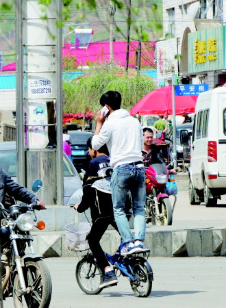 时间:2015年5月3日 自述:小伙站在自行车后座上打电话,真是够危险的。 点评:是不是觉得这样通话更“高端”,信号也更好。