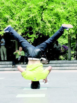 时间:2015年5月2日 自述:小伙子功夫了得,跳街舞,玩倒立,脑袋直接顶在地上。 点评:看把后面那个老大娘惊的,这种舞蹈原来可没见过吧。