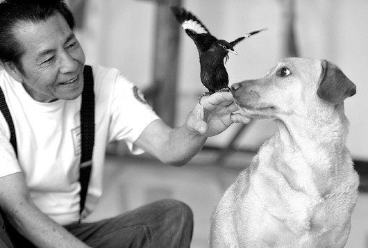 闲暇逗逗小动物,陆伟德的爱犬“tea”是从香港带来的,八哥“happy”是在济南买的,他们只听英文,而且很听话。