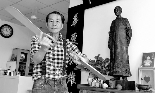 八斩刀是咏春的特有利器,陆伟德舞起来神出鬼没,他背后就是叶问塑像。
