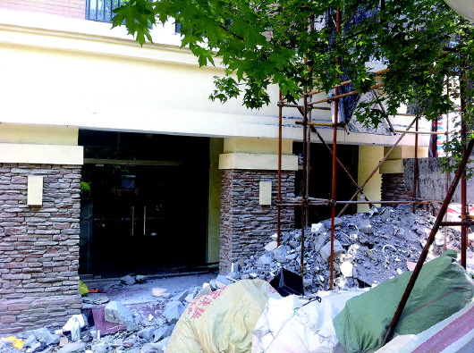 ◤争议楼已经停止装修,楼外堆放着建筑垃圾。 本报见习记者 郑帅 摄
