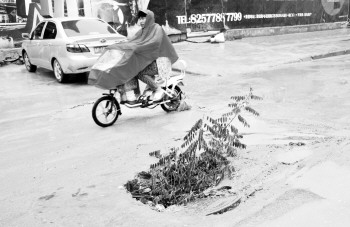 25日,花园北路非机动车道上一下水道井盖塌陷,附近居民介绍,昨天曾有路人骑车摔进坑中,附近居民在坑里插上几根树枝来提醒过路市民注意。                                         本报记者 邹俊美 摄