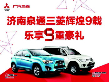 为回报广大市民和车友的厚爱,济南泉通广汽三菱9周年纪念之际,特推出9项钜惠,新老车主购车均有钜惠惊喜,购车的绝佳时机!详情咨询济南泉通各大4S店。