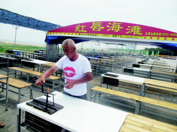 7日,在红唇海滩自助烧烤区,工作人员正在清理无烟烧烤炉具。 本报记者 王永军 摄