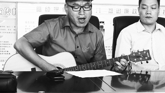 山东援疆教师张峰为援助的小学谱写校歌,业余时间教孩子弹吉他。本报记者 乔显佳 摄