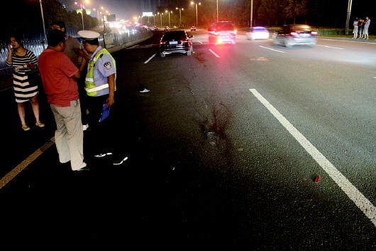 “一共三个人,想钻过护栏到对面去。其中一个男的与护栏还有两米的距离时,被一辆小型客车给撞了。”王先生说。