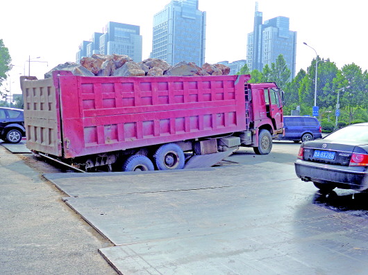 28日,市民郭先生向本报热线反映,近日,工业南路正在进行热力管道施工,不少路口因施工需要铺设了钢板,钢板厚度不够,大车开过像“跷跷板”有安全隐患。记者闻讯赶到现场准备采访,恰巧眼睁睁看着一辆超载的大货车直接轧弯钢板栽进坑内。