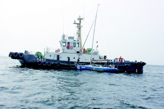 在“海巡05907”轮的监护下,“威港拖33”轮拖带帆船“CANAVAL”到威海港。