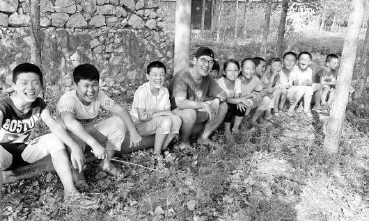 《守与寻》微电影导演渠帅和留守儿童在一起。