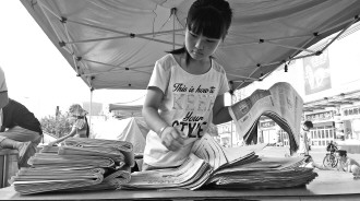 17日,营销秀近尾声,在汽车站售报点,为了保持名次,不少小报童都增加订报数量,做最后的冲刺。图为小报童张雨鑫近几天一直保持100份报纸数量。