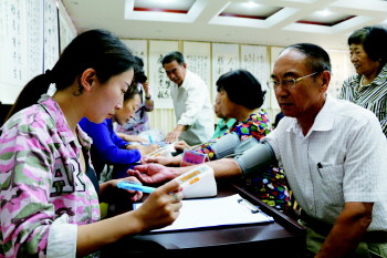 机关医院专家义务为居民测血压、检测体内一氧化碳含量。 本报记者 邵芳 摄