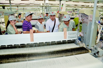 在企业流水线的车间里,一根根的棉线,纵横交错织成布匹,每个工序都需要纺织工人的严格把关。所谓内行看门道外行看热闹,各有各的工作和技巧,但每个环节都紧密相连、环环相扣,中行员工赞叹不已,与齐赛员工交流密切。