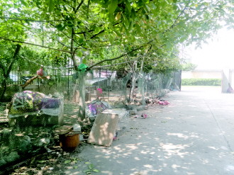 刚到“养鸡场”,记者就闻到了家禽的粪便散发着一股浓烈的臭味。整个“养鸡场”被塑料网笼罩着,这个小院子里还养着几只鸭子和鹅,几个随意摆放的木箱成了它们的窝棚,整个“养鸡场”绿化带被破坏。