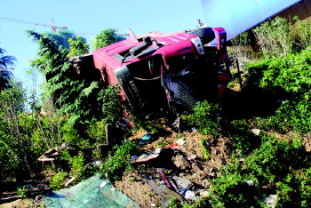 13日早上7点左右,青兰高速交警黄岛大队接到报警电话,一辆重型货车行驶到青兰高速62km黄岛立交处撞上护栏侧翻到桥下,货车司机受伤。情况紧急,交警一边联系120急救车,一边赶往现场。民警抵达现场后看到,路边一大截护栏已被撞断,货车向右侧翻到立交桥下,车头变形严重,车牌、零件散落一地。头部受伤出血的司机已经自行从驾驶室里爬了出来。