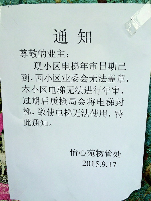 记者随后来到怡心苑物业管理单位,济发物业怡心苑项目部。物业主管吕先生表示,目前业委会成员走的走搬的搬,几乎处于瘫痪状态,因此居委会已不允许业委会继续使用公章。但因为年检问题紧急,已将盖章问题解决,7号楼2单元电梯可以交付年检了。