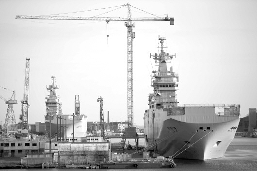 2015年5月25日拍摄的两艘“西北风”级两栖攻击舰。 新华/路透