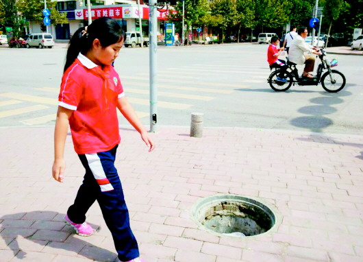 颖秀路与沁园路交叉口西南角处裸露的无盖井。