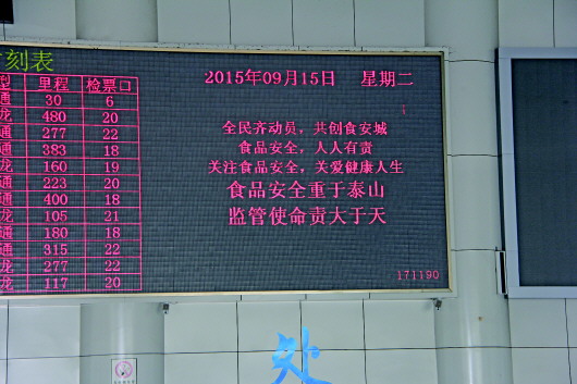 候车大厅内的LED显示屏上滚动播出宣传标语。 通讯员 于晓晖 摄