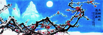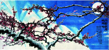 “一花一世界,一石一乾坤,画家乃情种,草石其无心。”“情种”何止画家。“感时花溅泪,恨别鸟惊心。”、“三分春色描来易,一段伤心画出难。”更是著名诗词家情致所至。张光明擅画梅,但他笔下之梅,有别于古人、今人。古今名家,有取梅之“闹”、“倔”、“奇”、“情”、“静”等等。而张光明先生独取其“净”。在他的梅花中不见一尘之染,不见一雀之俗,而把梅花植于雪山、旷野、山崖、溪畔。《丹馨朗月映琼宇》是历十年的思考,反复构图,反复修改而成的。画家在记叙中写道,“2003年他在无锡梅园写生。晚上一人步入梅林,远处隐隐传来太湖的波涛声,近处的山夜一片雪白,月光透过梅丛上的冰雪,显得更加冰清玉洁。清风吹过梅林,把寒香洒向寰宇……偶一回首,一支挺拔的梅枝,穿过梅丛跨越苍穹,直插白玉般的明月中。”这一瞬间,平生难求,终生难遇,它永远定格在画家的脑海中。2014年正月13日,济南下了一场大雪,他触景生情画出了《丹馨朗月映琼宇》这幅画卷。此卷用“组合法”把无锡之梅开放在“玉龙山”下。玉龙山则用图案式的构图,既扩张、又变形,突出空白,露出山形。而大面积的酞青蓝,把寒夜的清冷、清彻、清透、清静表现得十分自然。而那挂在夜空的皓月在酞青色的衬托下更加洁白如玉。画家用豪放的斗笔肆意纵横,写出梅花倔强的枝干。画家把存储十年的情感,倾泻在宣纸上。让我们共同享受到“丹馨朗月映琼宇”的深远、空旷、寒香的气息。画家的风采也展现得淋漓尽致。