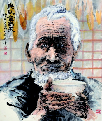 张光明尊崇古贤、哲人及丹青高手,在他们的影响下,始终坚持做人要真诚,作画要有真情,这种思想养成了“画由心出,心必真诚”的创作理念,由此创作出大量真实感人的作品,集中收录在《张光明书画》中(中国文联出版社出版)。在八十余幅作品的六个系列中,其中张光明先生的人物画系列,虽仅几幅,但每一幅都是他真情实意的流露,也是他绘画才情的展示。《民以食为天》描写的是一位农民。这是由滨州回济南汽车上的真实感受。画家故乡,是老惠民地区,许多父老乡亲熟悉的面孔和习惯动作,撸着袖子,露着胳膊,满脸皱纹,一双双真诚、朴实的眼睛呈现在面前。当吃单饼掉下碎片时,老人捡起放进口中的举动,刺痛了画家的心,这一情景逼迫画家去表现他,去刻画他。画家借用丰收后,还双手端着大碗的动作,突出了农民惜粮如命的精神,特别是那憨厚、正直的双眼,画家着力精心刻画。在运用中国画笔墨的同时,借用西画之法,将明暗关系处理得恰如其分,老人那炯炯有神的目光让人心灵为之震颤。
