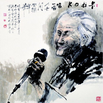 《卡拉OK》是为同学母亲庆八十大寿时获得的素材。同学母亲,从年轻孤自一人,历尽沧桑,尝遍世态炎凉,在她八十大寿的宴会上唱出了“我是一棵无人知道的小草……”听着这如泣如诉的演唱,画家热泪盈眶,因为自己也是由母亲独自抚养长大的。命运相连,母爱相通,在泪水和情感的交融下母亲的形象屹立在眼前。据载,东晋画家顾恺之画人物,数年不点目睛,其故“传神写照,正在阿堵(眼睛)之中”。张光明先生深谙此意,但画家塑造的老人却是一位双目紧闭的艺术形象,这给创作增加难度,但这种难度,在画家笔墨语言下,迎刃而解。张先生狂放的笔墨画出了老妇的衣袖,借脸上的皱纹刻画出老人的内心世界。突出眯着的双眼,把欲言又止的深情,把平生艰辛、痛苦、坎坷、不幸都统统埋在了心里,展示给人们的是母亲的仁慈和靓丽,这就是伟大的母爱呵!此画在《中国妇女》杂志发表,并在多家报刊转载后,引起了人们强烈共鸣。