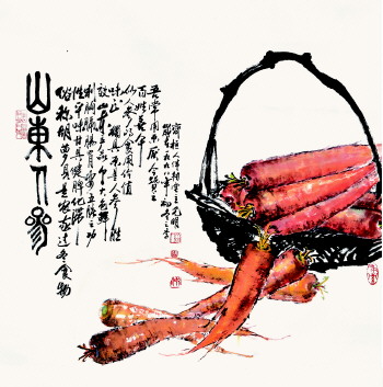 小品是《张光明书画》中的另一特色。方寸小品,乃是大天地。画家笔下的萝卜、葫芦、辣椒、西红柿、知了、蝈蝈,甚至极小的蚂蚁等等。在画家笔下无不带着情致。那带着泥土芬香的大红萝卜,是献给童年伙伴的赞歌;那带着胎毛稚嫩的葫芦,长大后被摘是对全家人的安慰;“外面红又绿,里面辣又辣,大人都爱吃,小孩见了怕”的大青椒,是祖孙诗画合作时的天伦之乐;而西红柿,记录的则是儿时在家一段生活乐趣。画家用真情实感在浑厚的笔墨下,在丰富的色彩中,描绘的客观事物总是鲜活、亮丽。达到传神的境界,令人赏之如醉、品之欲滴。