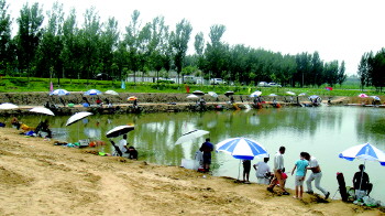 短竿钓池边打法:初到一个黑坑除了了解鱼情,还要熟悉黑坑的环境和地形,根据其特点选择合适的战术打法。本次作钓之前塘主投放新鱼,考虑到新鱼有绕池四周环游一圈的习性,再加上黑坑地形环境允许的条件下选择短竿钓池边的打法效果更佳。因为对于老鱼来说4、5米的位置长期有饵料在,老猾鱼首先会感觉到那个位置有危险,其次饵料寄存多了鱼也会感觉不舒适而游到相对干净的池边来活动,因此选择3.6米短竿作钓比较合适。配合短竿钓池边的方法在操作上也要有所改变:首先每一竿都要抛到一个固定的点上来集中诱鱼,但是每一竿也不能抛满竿,当钓饵落到窝点以后,将钓竿垂直水面松放下去。其次竿尖上扬,使多余的水线提起来,这样做在中鱼时手腕发出的力能直接传导至钩尖,方便及时刺鱼。当然短竿作钓不像长竿有一定水线的距离,所以扬竿幅度一定要小,否则就会缠线绕线。若是作钓的环境允许甚至可以贴着岸边来钓,因为这是一片钓放较少的区域,新鱼猾鱼都会在这里停留。